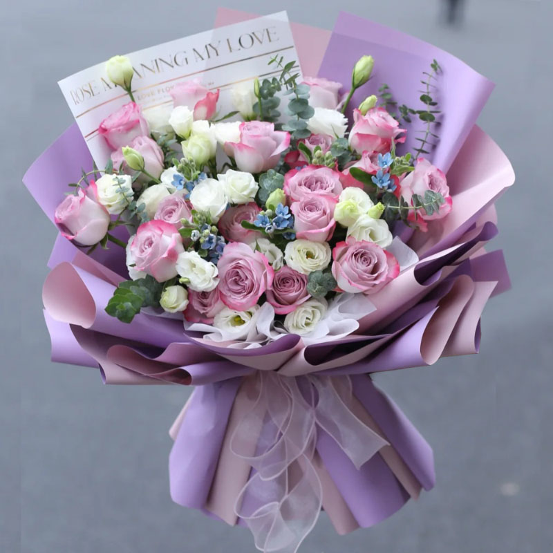 - 19枝紫玫瑰,桔梗,尤加利,蓝色满天星;如图紫色包装