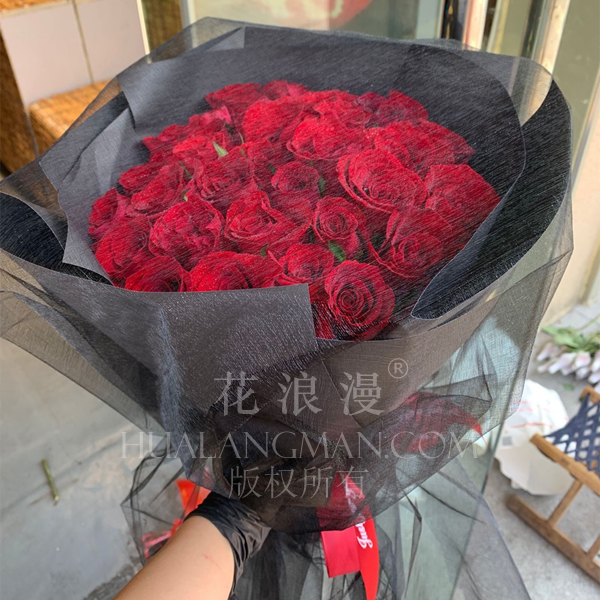 - 33枝红玫瑰,黑色包装,黑纱覆盖;黑色包装,黑纱圆形包装
