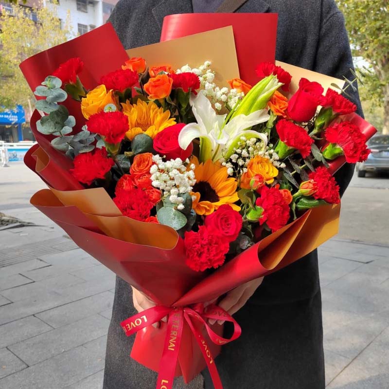 - 9枝红玫瑰,15枝红色康乃馨,3朵橘色或香槟玫瑰,3枝多头橙芭比(多头泡泡),1枝白色多头百合,2枝向日葵,满天星,尤加利;如图包装