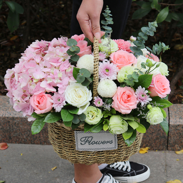 - 11枝戴安娜粉玫瑰(或粉雪山玫瑰),8枝多头绿桔梗,1个粉色绣球,3个乒乓菊(或白玫瑰替代),小雏菊或太阳花点缀,尤加利,栀子叶;手提花篮