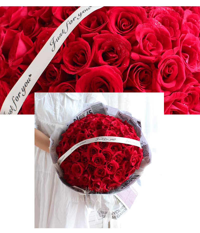 99枝红玫瑰,字母丝带;如图英文报纸包装(或浅色包装纸)