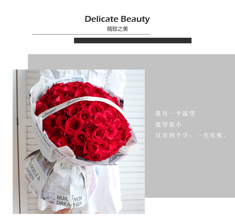 本款花语:99朵玫瑰代表天长地久的爱情。红玫瑰代表着浪漫,象征着深沉的情感和热烈的爱情。送红玫瑰花象征着年轻的爱情、天真、纯洁和朴实的美丽。