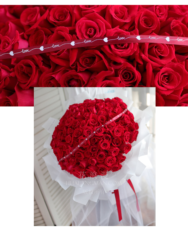 - 99枝红玫瑰,红色细丝带;如图内衬波浪纱,外白色韩素纸,白色仙女纱,红色蝴蝶结