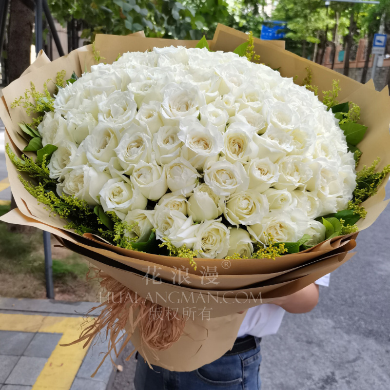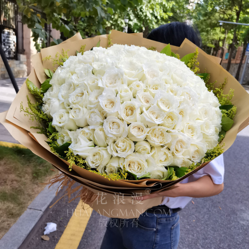 - 99朵精品白玫瑰,外围黄莺栀子叶;如图颜色包装纸,圆形平角包装,蝴蝶结或拉菲草扎束