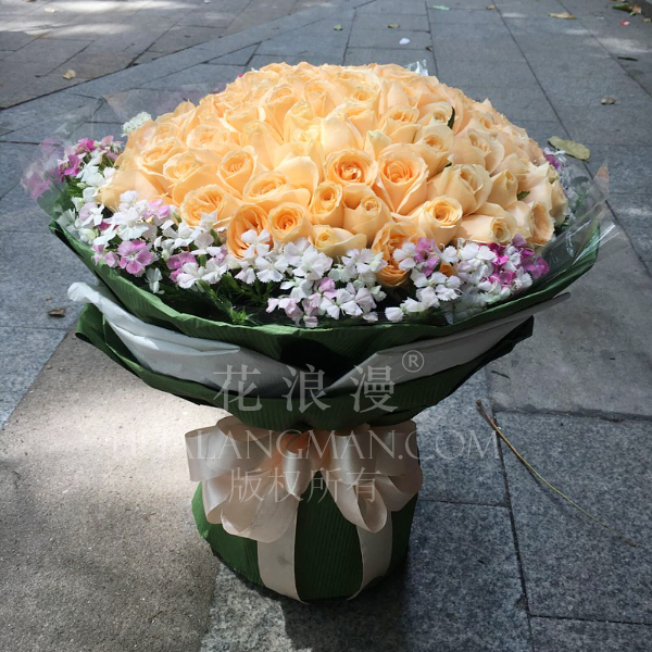 99支香槟玫瑰,相思梅(或满天星)围绕一周。;墨绿色皱纹纸圆形包装,香槟色蝴蝶结扎束
