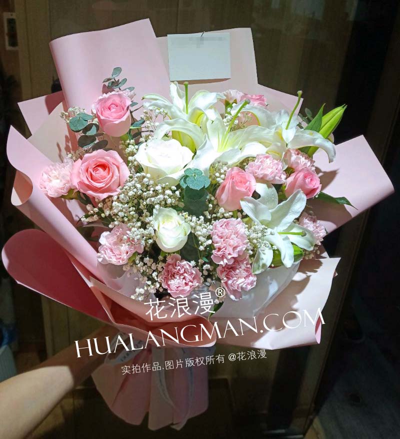 - 2支白玫瑰或香槟玫瑰,6支粉玫瑰,9支粉康乃馨,2支多头白色香水百合(或粉色百合),粉色或绿色桔梗 ,满天星,尤加利;粉色韩式包装,丝带