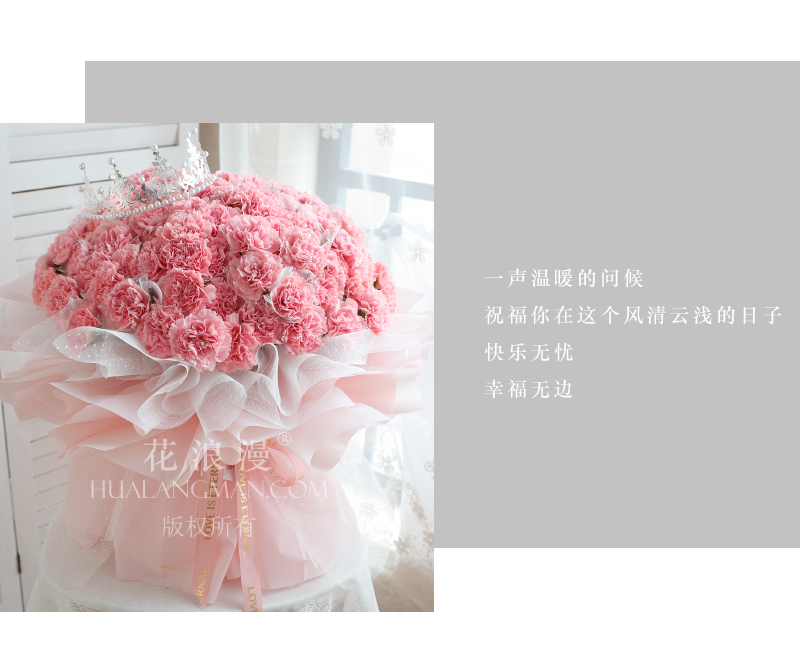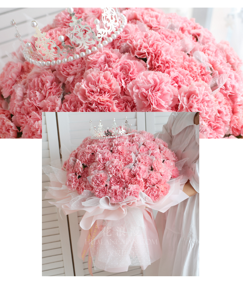 99朵粉色康乃馨,皇冠;白纱,浅色包装