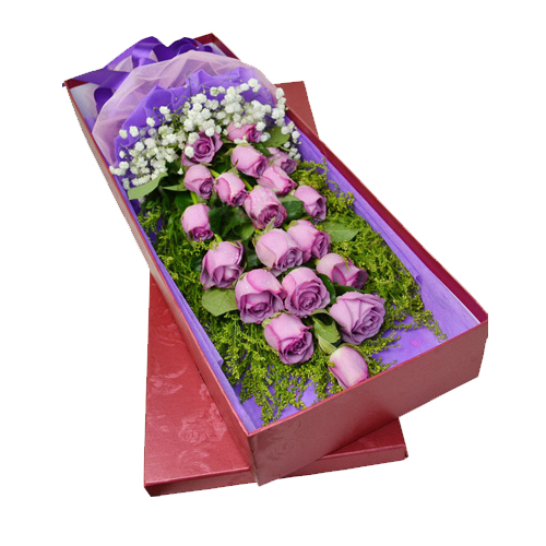 19枝紫玫瑰,黄莺,绿叶满天星搭配(若紫玫瑰缺货将以苏醒玫瑰替代);紫色棉色包装,紫色蝴蝶结装饰。高档长方形礼盒包装(红色或咖啡色)