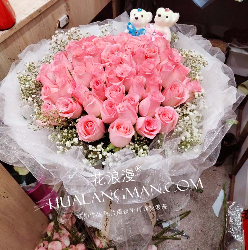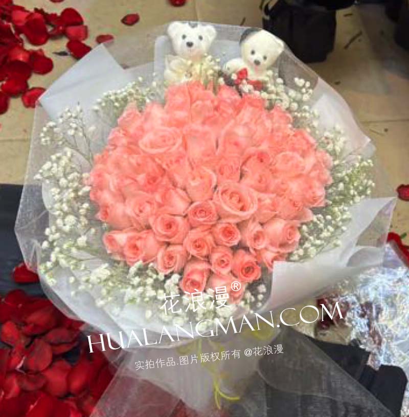 - 66枝戴安娜粉玫瑰,2只小熊,满天星点缀;如图包装