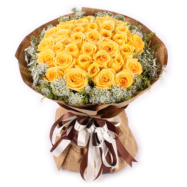 - 33枝精品黄玫瑰,蕾丝(或满天星)点缀;如图包装