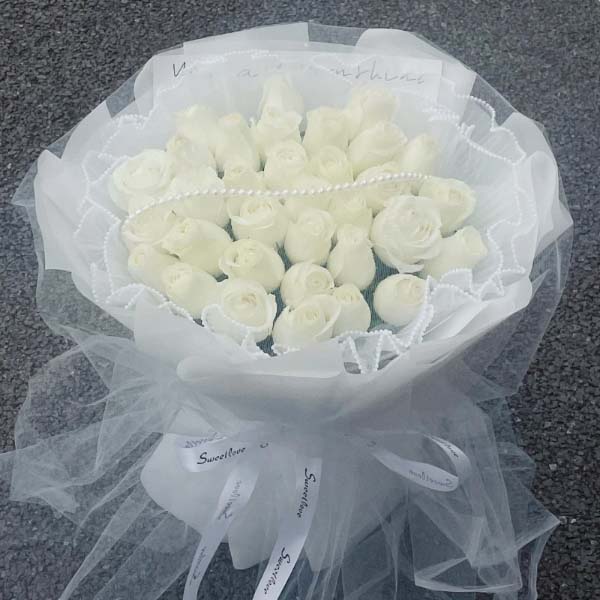 - 白玫瑰33朵,粉色相思梅(或满天星)点缀周围;如图包装