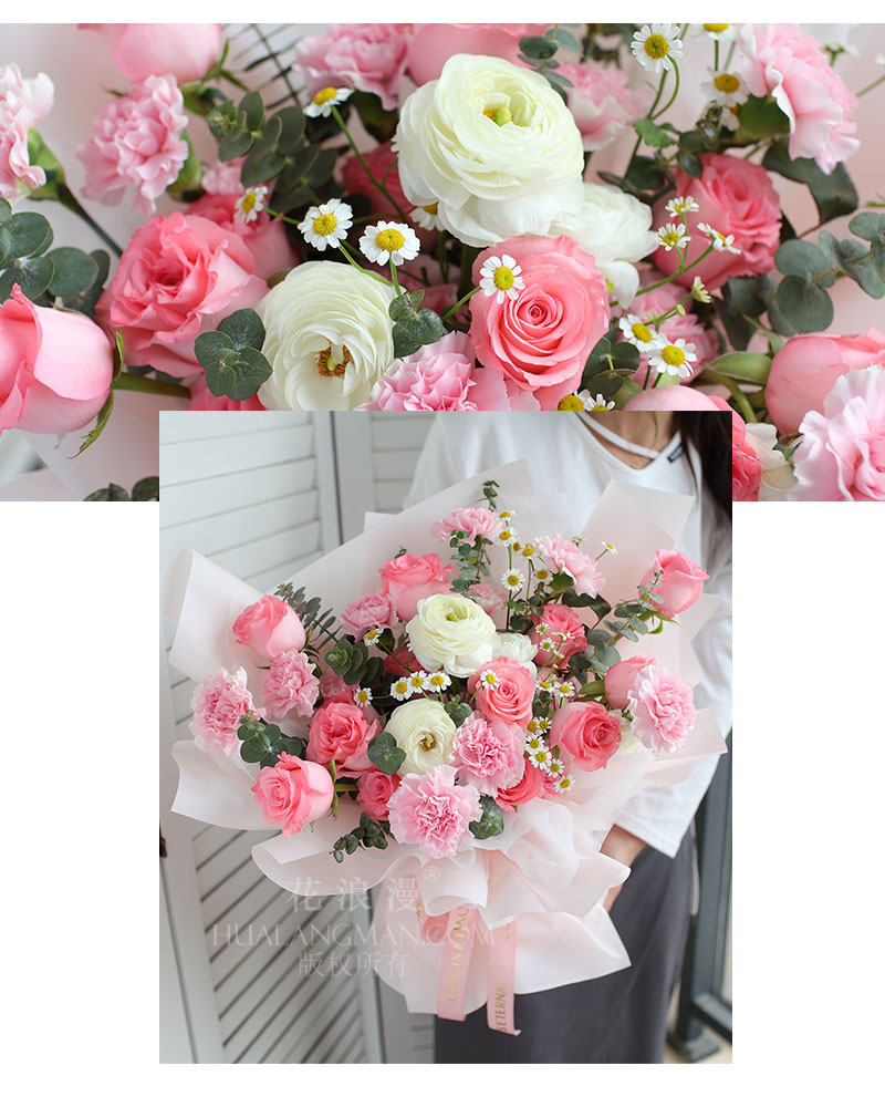 - 13枝戴安娜玫瑰(粉玫瑰),16枝粉色康乃馨、洋牡丹3朵(或3枝洋橘梗)、洋甘菊、尤加利;如图粉色内衬,粉色韩素纸包装