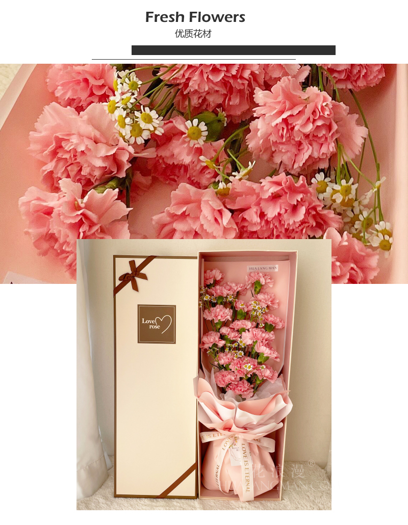 19枝粉色康乃馨,洋甘菊点缀;如图包装,长形花盒