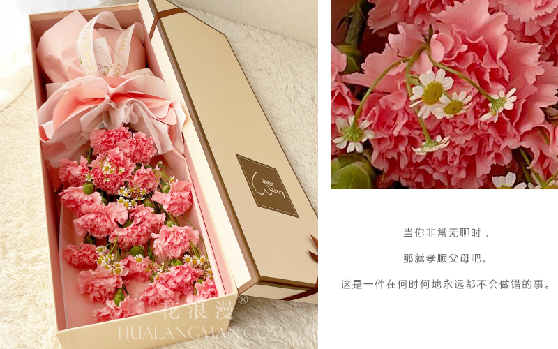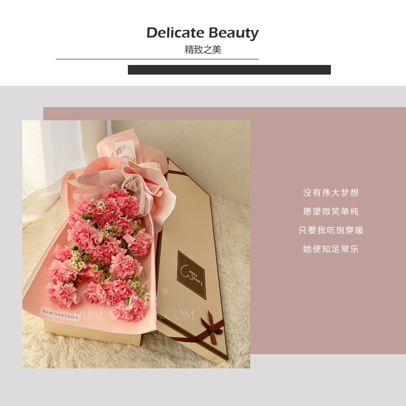 本款花语:康乃馨是最传统的母亲之花,粉色的康乃馨代表感恩。