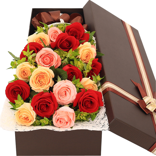 红玫瑰、粉玫瑰、香槟玫瑰共19枝,配草(尤加利);咖啡色长形花盒