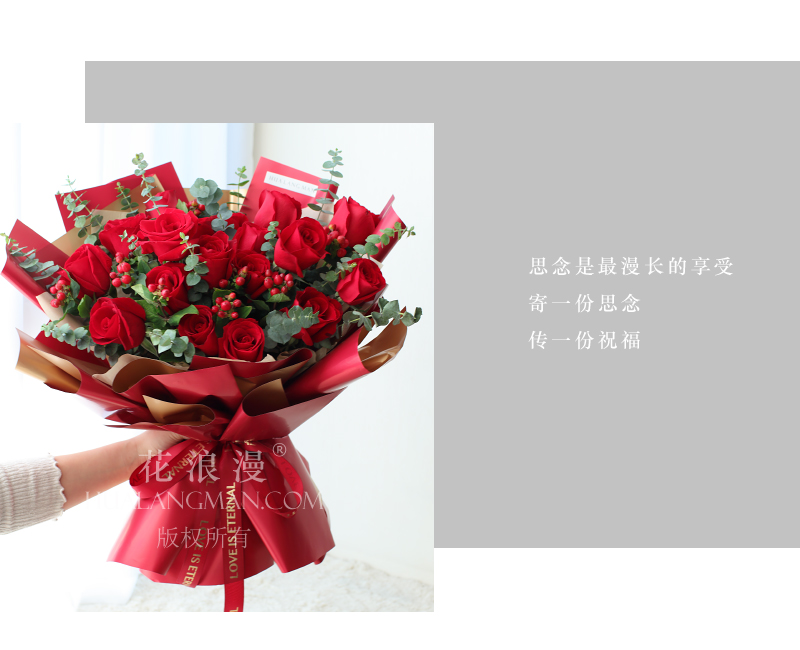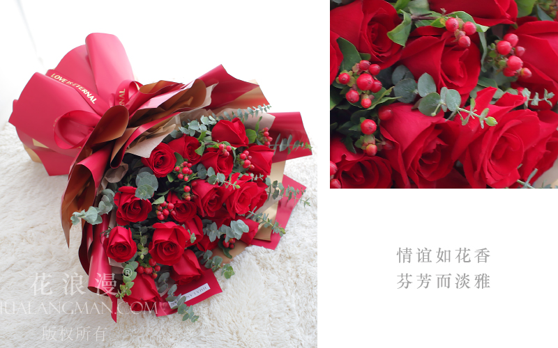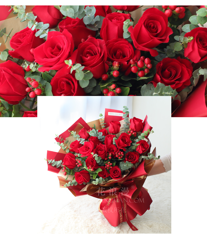 - 19朵红玫瑰,红豆,尤加利;红色包装,红色丝带