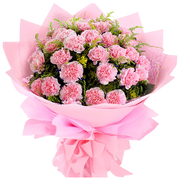36枝粉色康乃馨,黄莺间插;粉色包装纸如图多层包装,蝴蝶结