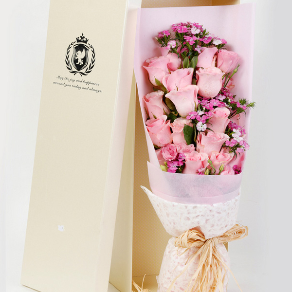 - 19枝戴安娜玫瑰,相思梅点缀(或粉色满天星);如图包装,浅色或灰色花盒