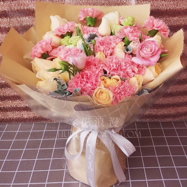 - 19枝粉色康乃馨,19枝香槟玫瑰,3枝戴安娜玫瑰,3枝多头桔梗;牛皮纸或者香槟色韩素纸如图包装