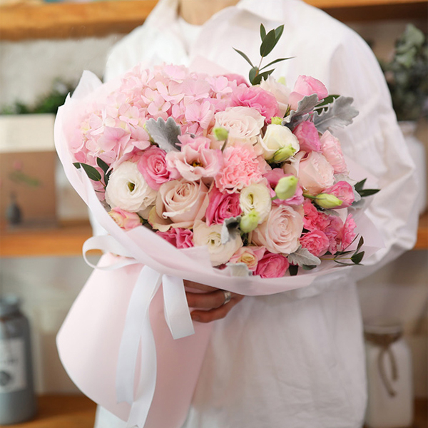- 粉康乃馨12支、戴安娜玫瑰19枝(或粉雪山玫瑰),1枝粉绣球(或粉紫色),多头白/绿桔梗3枝或白色风铃或其它配花,多头粉桔梗3枝,配叶,尤加利;粉色如图包装