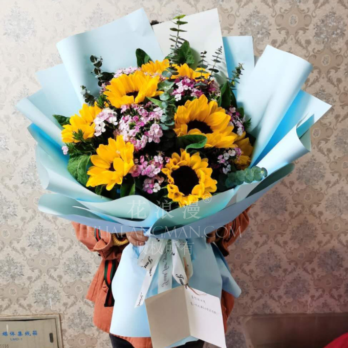 9枝向日葵,相思梅与尤加利配草点缀;如图包装
