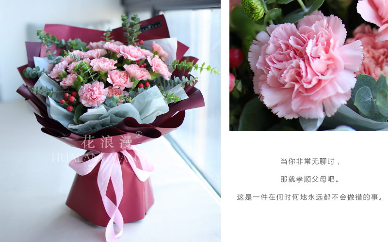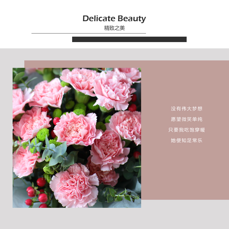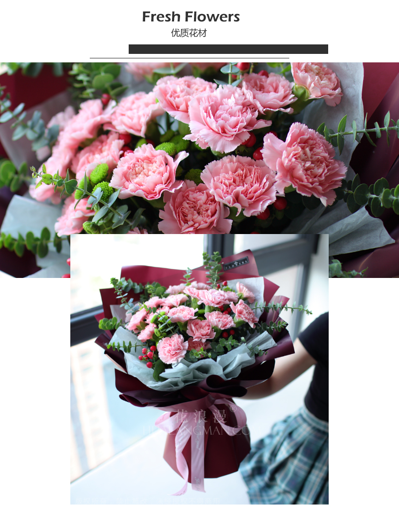 - 本款花语:康乃馨,大部分代表了爱,魅力和尊敬之情;粉康乃馨代表不朽母爱的象征。与玫瑰所不同的,康乃馨代表的爱表现为比较清淡和温馨,适于形容亲情之爱。