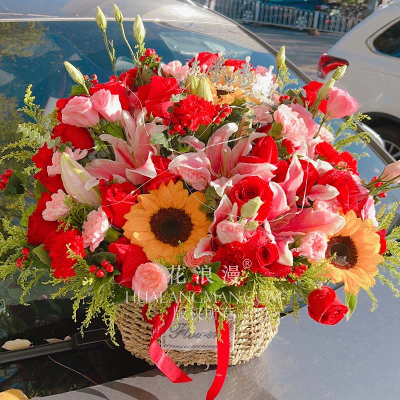 - 19枝粉色康乃馨,9枝红色康乃馨,19枝红玫瑰,3枝向日葵,粉多头香水百合5枝(10-15朵),粉桔梗,绿叶;手提花篮或抱抱篮,大气饱满制作