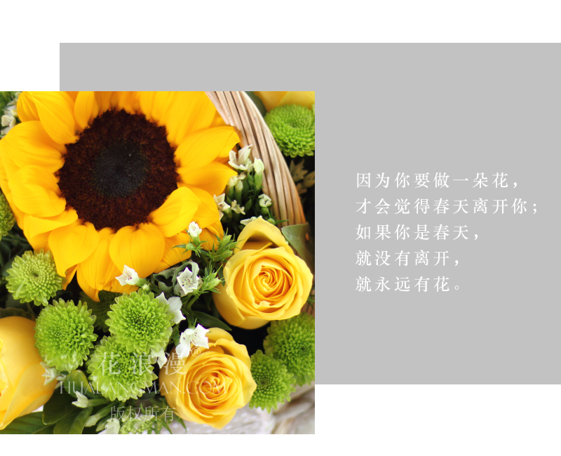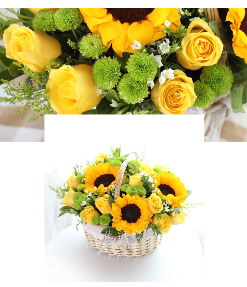 19朵黄玫瑰,3朵向日葵,小雏菊,满天星(本商品需要提前2-3天预定);手提花篮