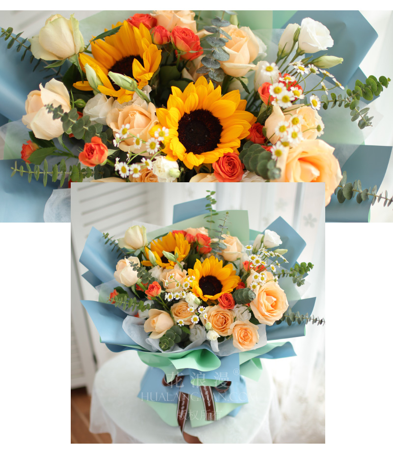 - 19枝香槟玫瑰,3枝多头泡泡(橙芭比),2枝向日葵,2枝多头桔梗,洋甘菊,尤加利;如图包装