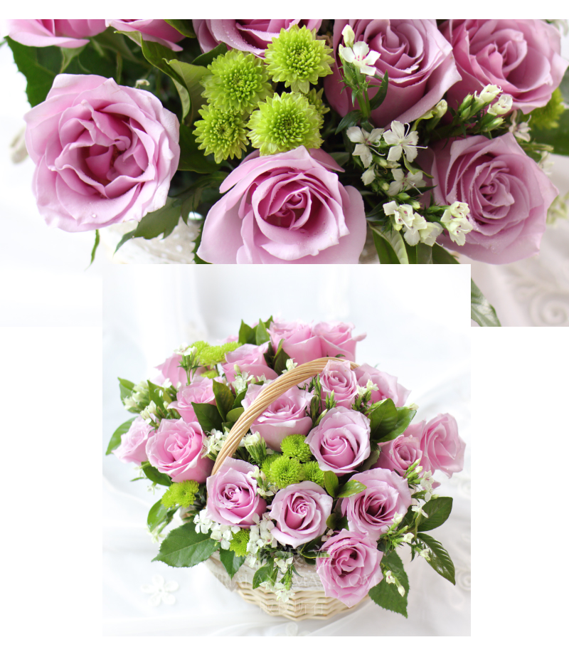 19朵紫玫瑰,小雏菊,相思梅或满天星;手提花篮
