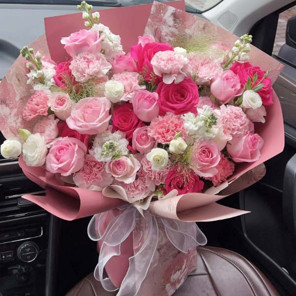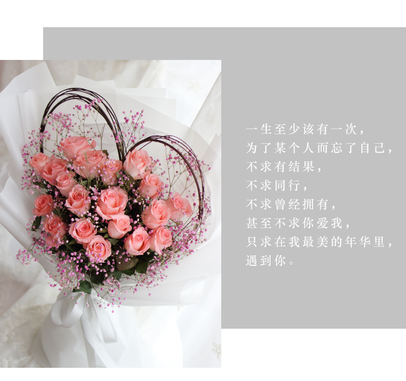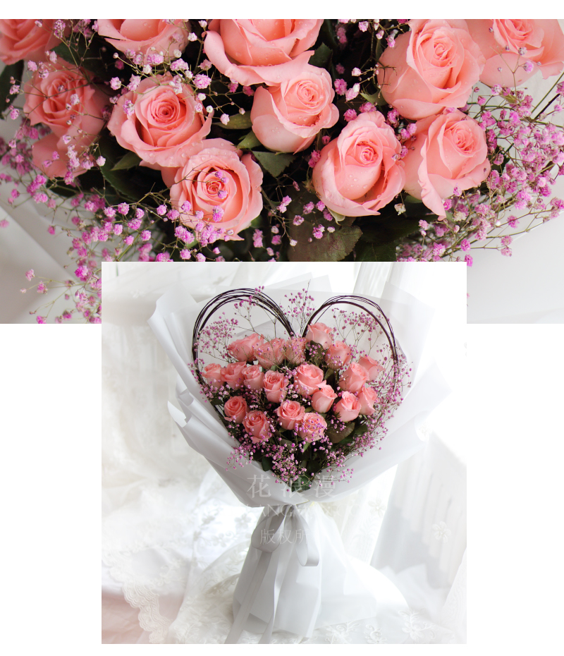 - 19枝戴安娜玫瑰,粉色满天星点缀,心形藤条或龙柳,此商品需联系在线客服确认有货再下单;如图包装