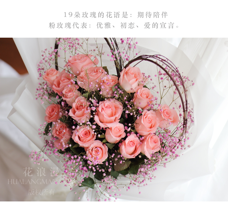 - 本款花语:19朵玫瑰的花语是期待陪伴、爱的最高点。 加以心形装饰,大气唯美。