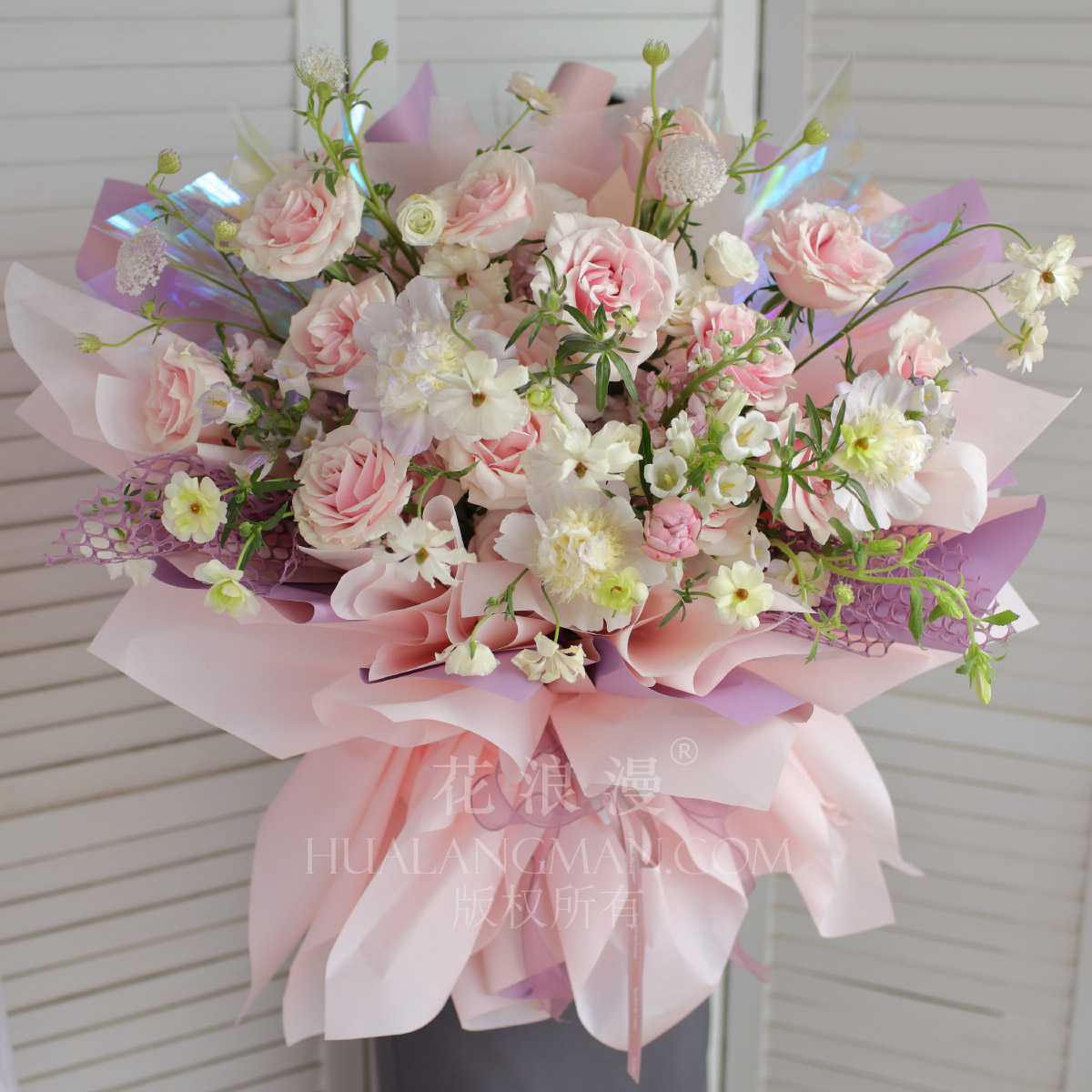 - 粉玫瑰(粉色主题)19枝,芍药3枝,粉色紫罗兰10枝打底,蝴蝶洋牡丹,翠竹,白色风铃;特别注意:本款商品含特殊花材可能会使用替代花材制作,订购前需与在线客服确认有货才可下单,直接下单遇部分花材缺货则使用替代花材设计;如图包装