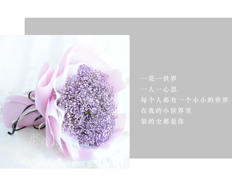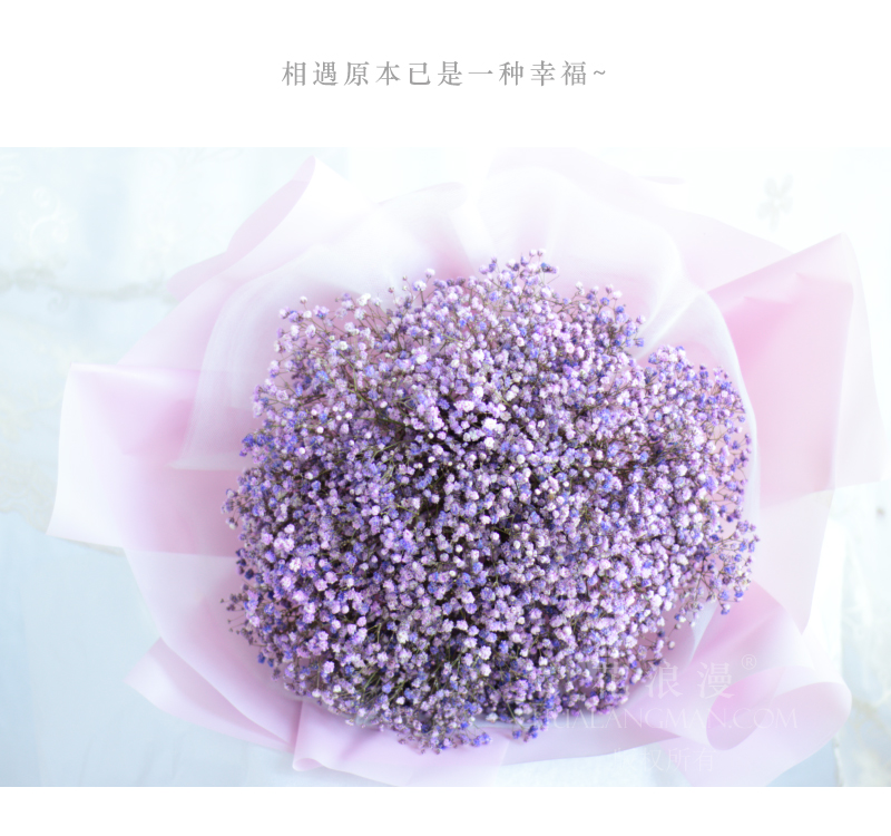- 紫色满天星1.5扎(若紫色缺货则以粉色替代);白纱或白色雾面纸内衬,粉紫色韩素纸包装,蝴蝶结。