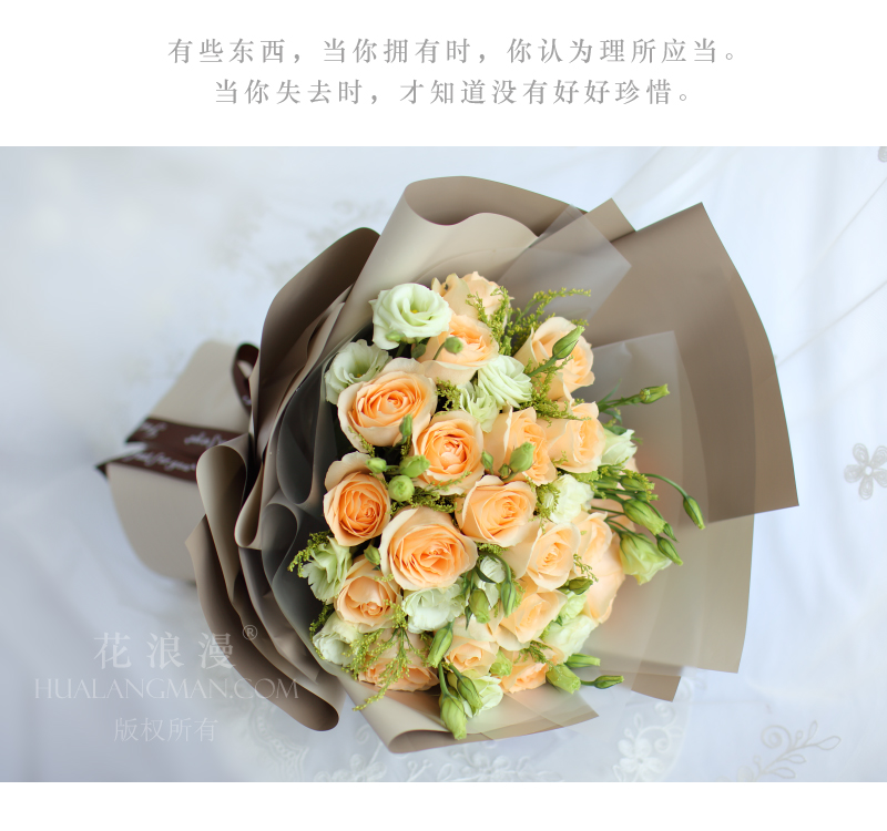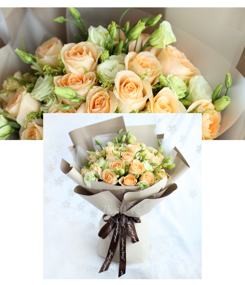 - 19枝香槟玫瑰,5枝多头绿桔梗,黄莺少量;包装如图