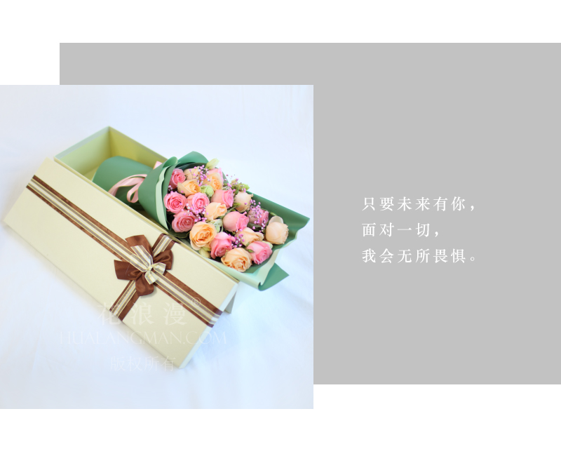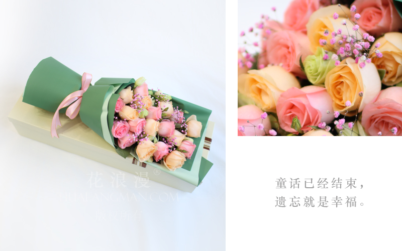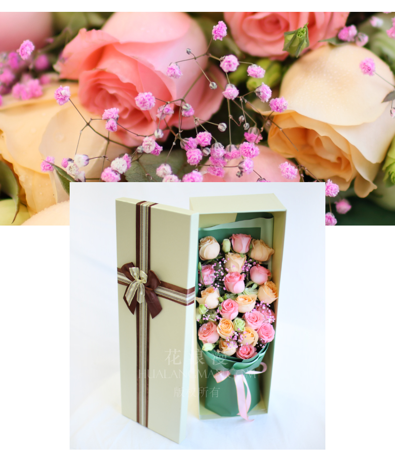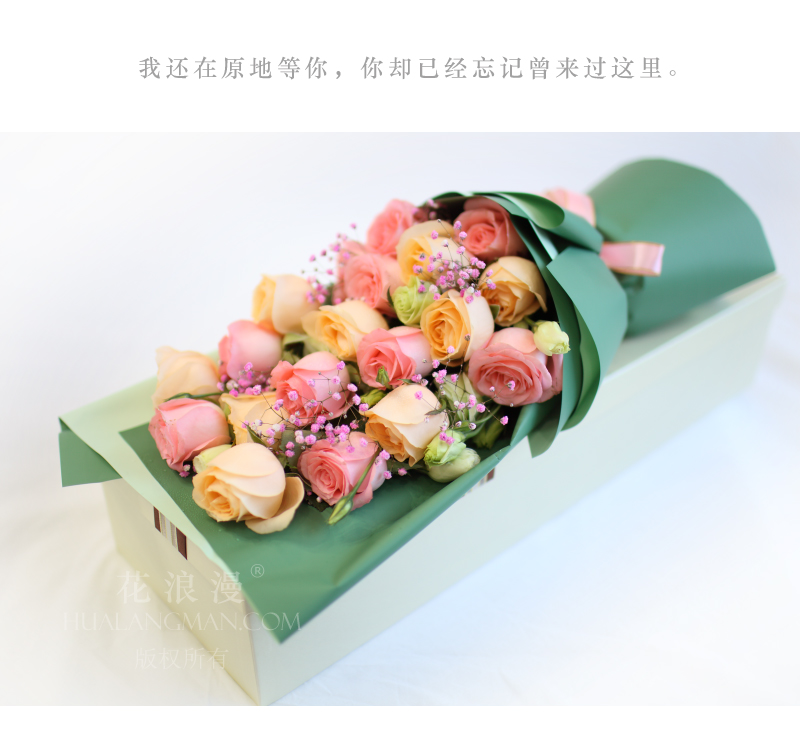 - 戴安娜玫瑰、香槟玫瑰共19枝,桔梗与粉色满天星间插;双色(深浅绿色)欧雅纸包装长型花盒