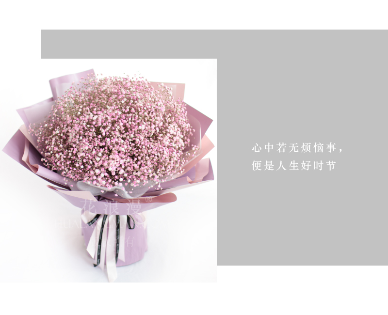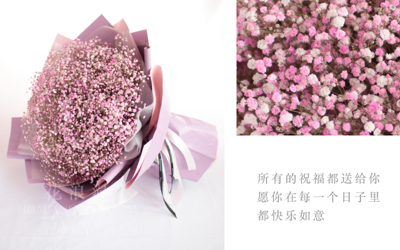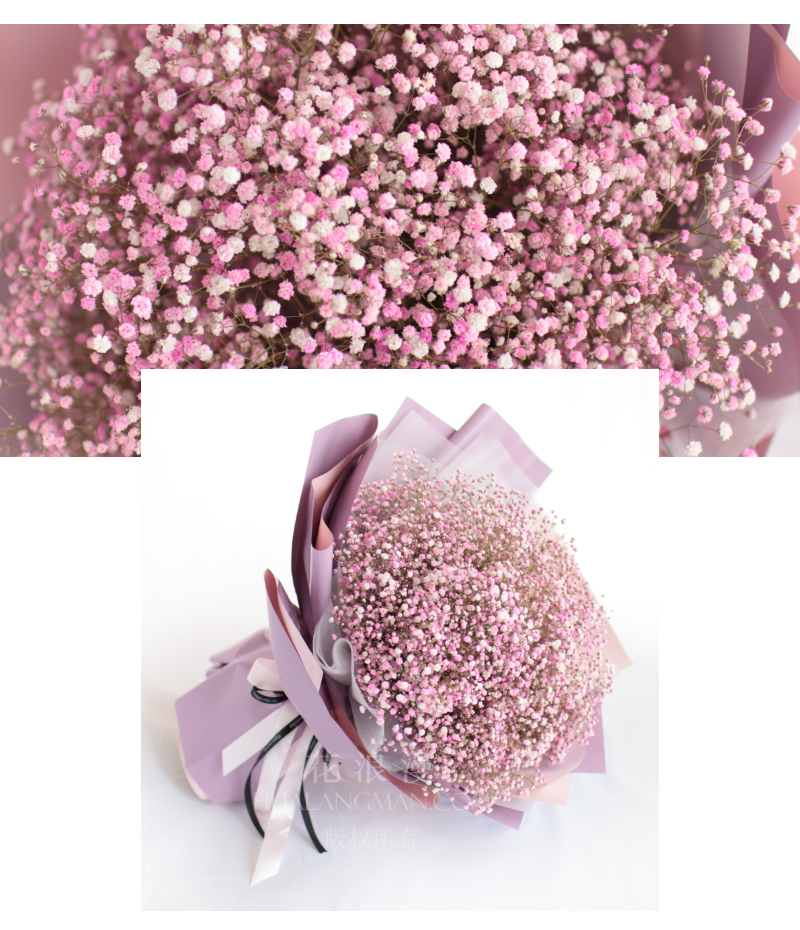 - 1扎粉色满天星;内白纱和白色雾面纸,粉紫色欧亚纸韩式包装,丝带如图