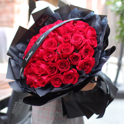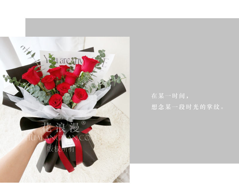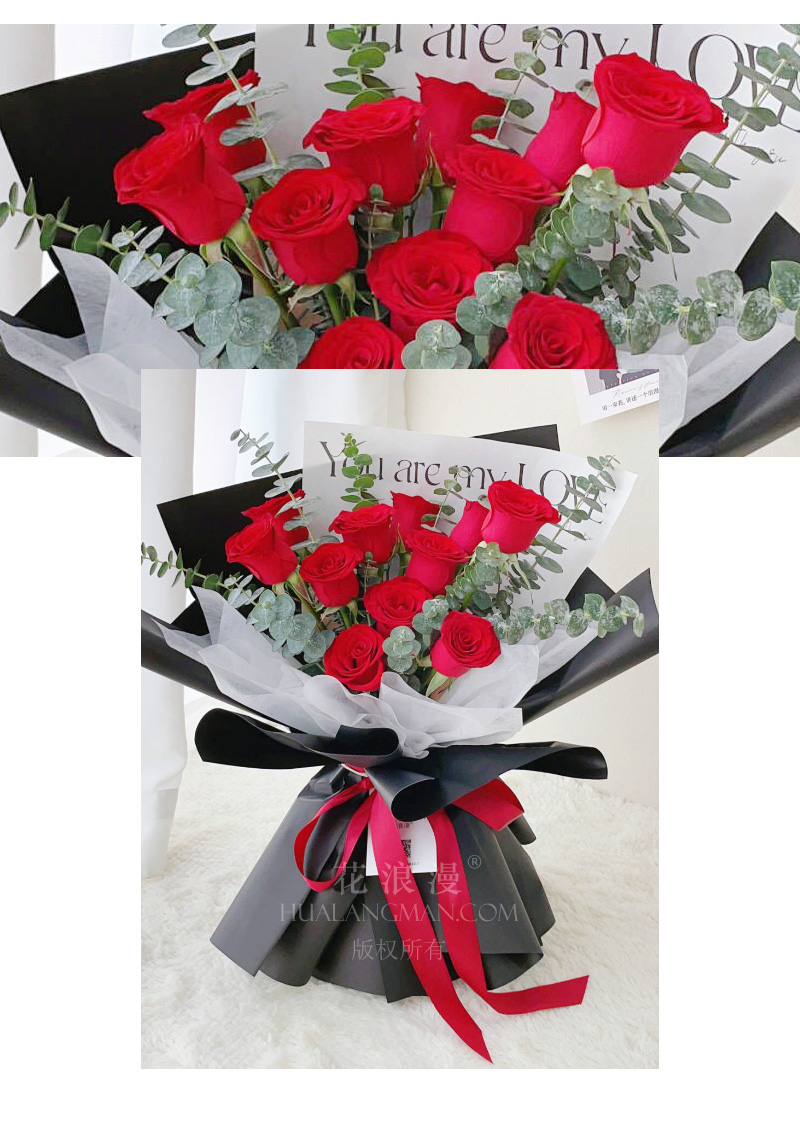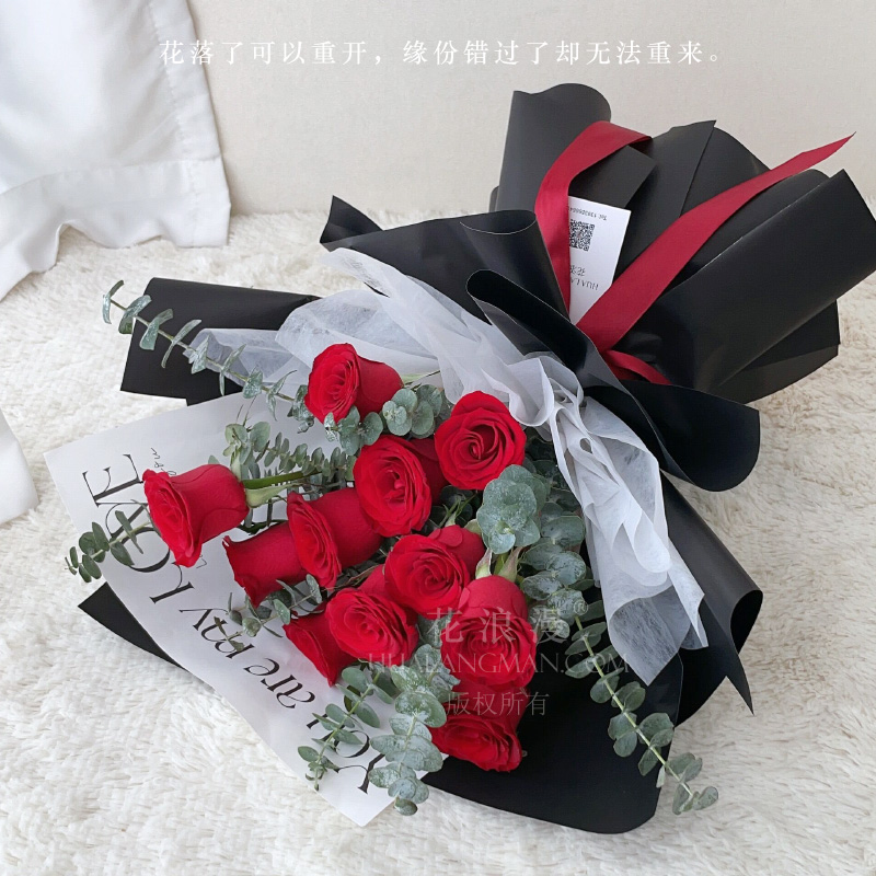 - 11枝红玫瑰,尤加利点缀;内衬白色雪梨纸,外深色韩素纸包装如图,红色丝带扎束。
