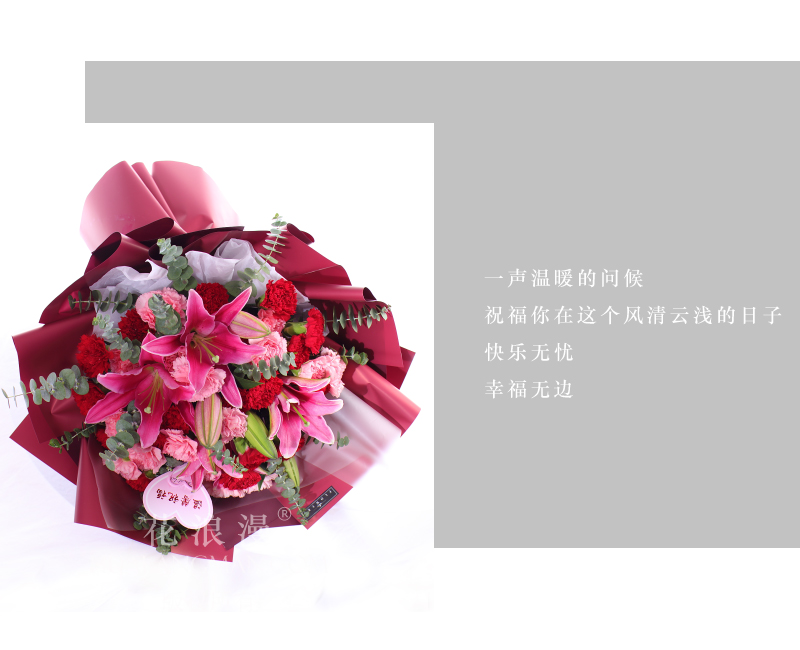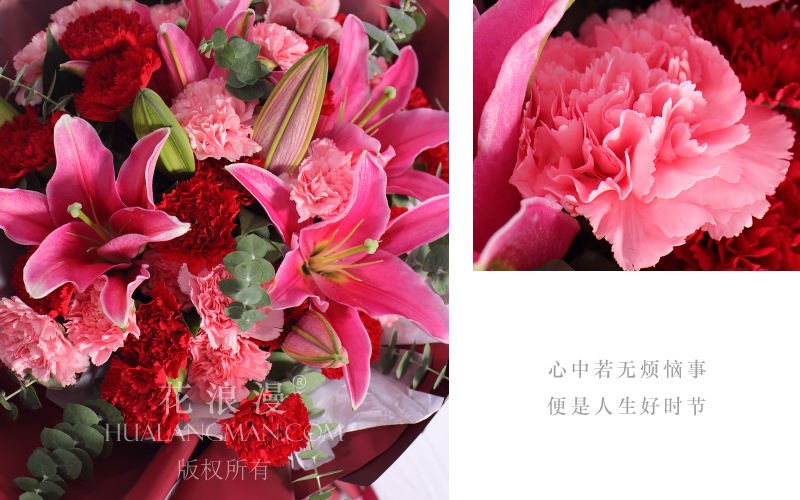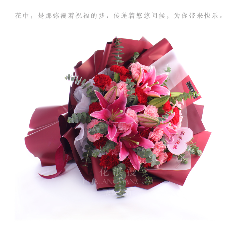 - 11枝红色康乃馨,11枝粉色康乃馨,3枝多头粉百合,尤加利点缀;如图包装