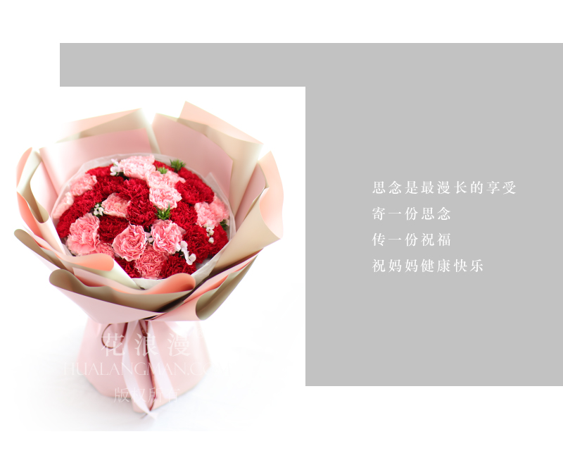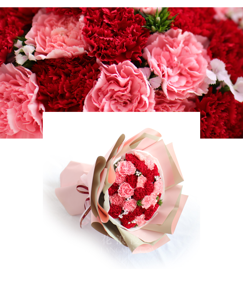 - 红色康乃馨与粉色康乃馨共三十三朵,少量粉色相思梅点缀;粉色欧雅纸如图包装,红粉丝带扎束。