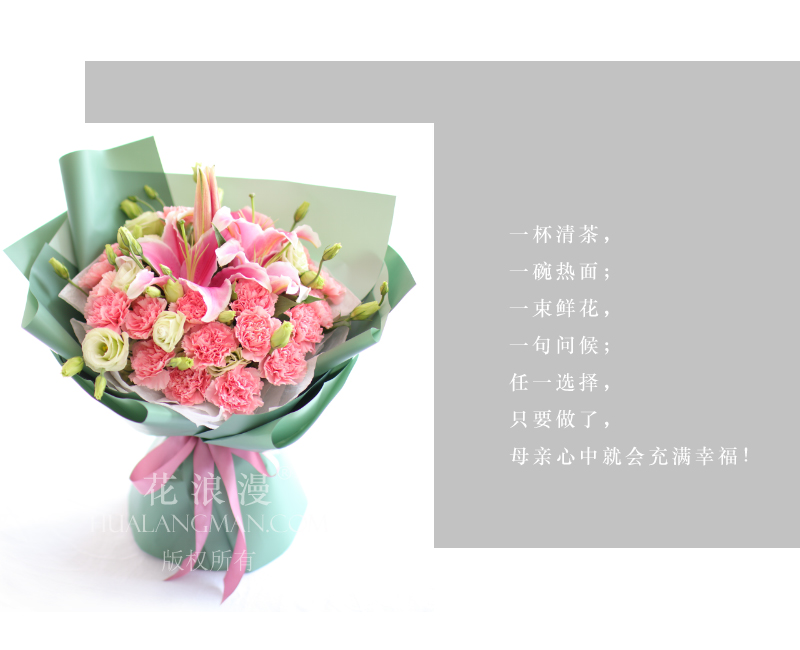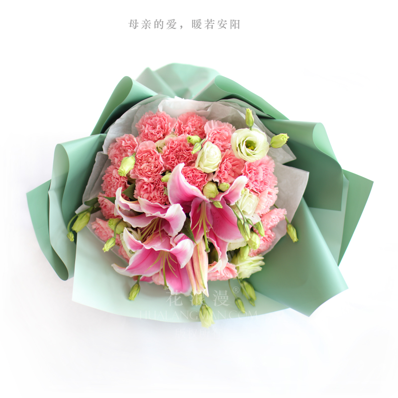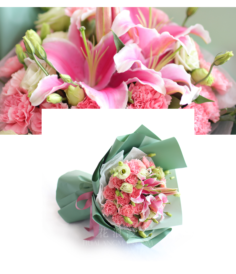 - 19枝粉色康乃馨,2枝多头粉百合,绿色桔梗间插;浅绿色欧雅纸韩氏包装,粉色丝带扎束。