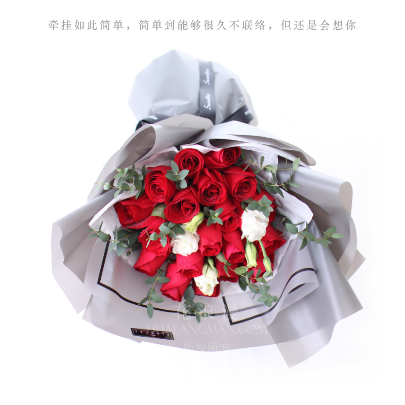 - 19枝红玫瑰,桔梗,尤加利;包装如图