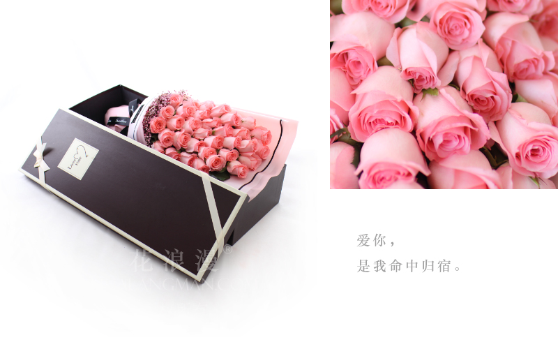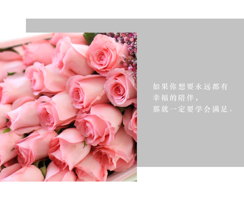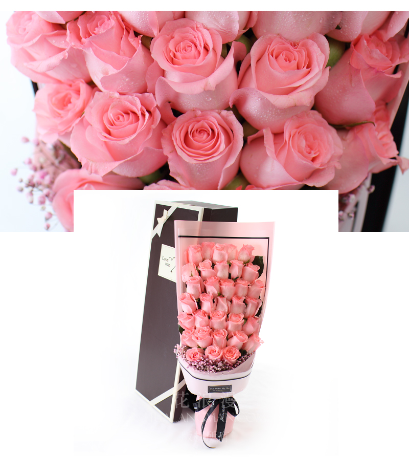 - 本款花语:33朵玫瑰花,表达出爱她三生三世的愿望。粉色玫瑰通常与女性气质有关,因此,粉玫瑰的含义自然是优雅和甜美。另外粉玫瑰还代表着温柔、欣赏、喜悦、感恩、初恋。