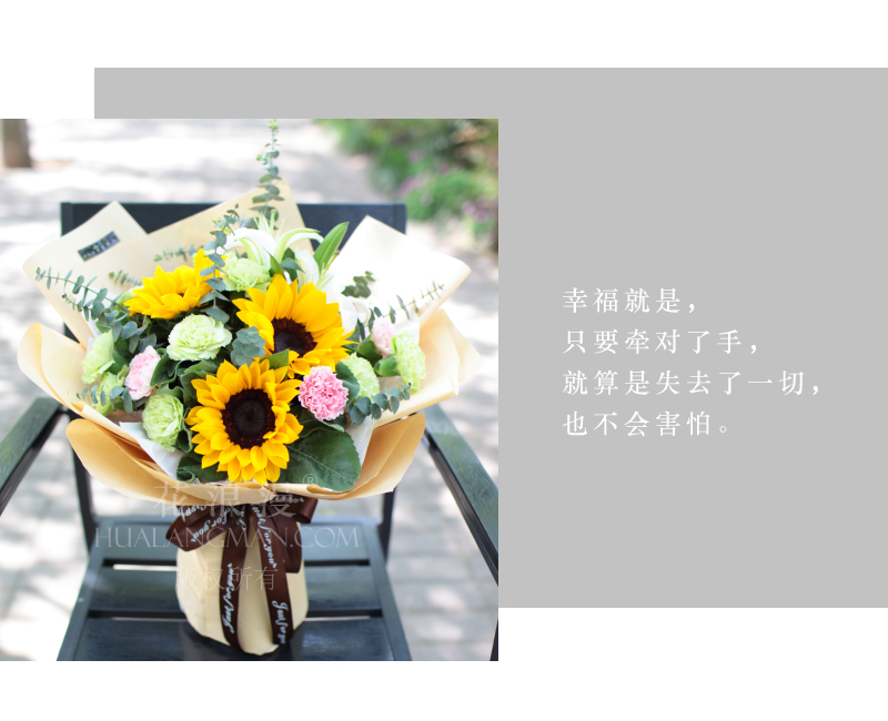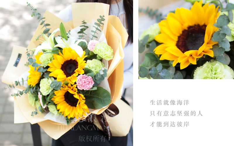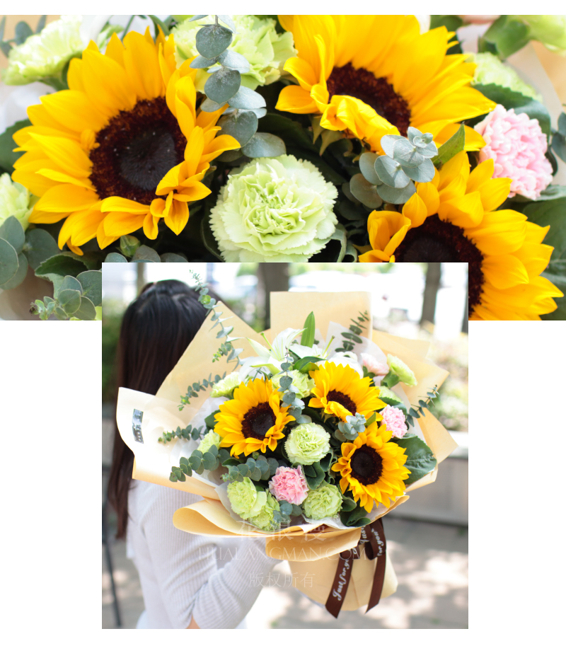 - 3枝向日葵,1枝多头白色百合,9枝绿色康乃馨(或绿桔梗),3枝粉色康乃馨,尤加利,配叶;内衬白色雪梨纸,外牛皮纸韩式包装,咖啡色丝带。