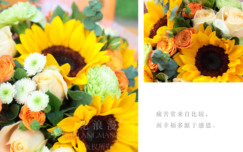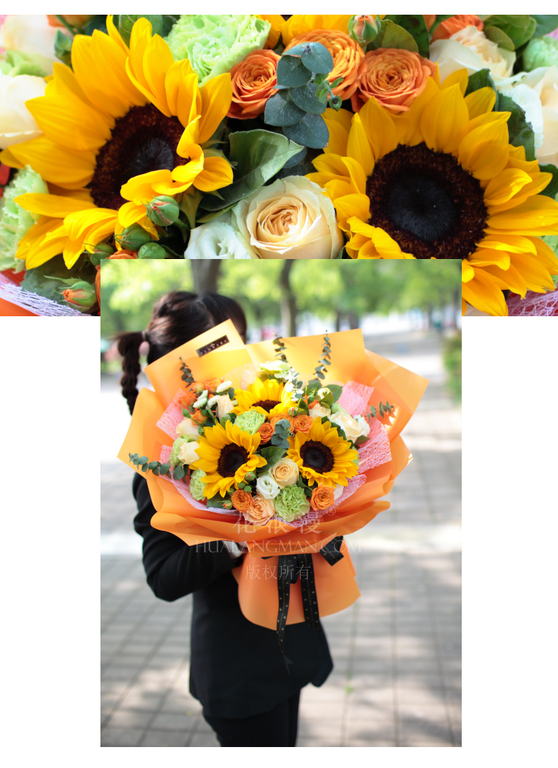 - 本款花语:向日葵给人带来积极向上的心情,送女友或送母亲,也适合送朋友