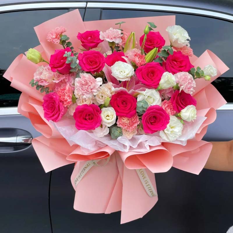 12枝弗洛依德玫瑰,13朵粉色康乃馨,1枝多头粉百合,5枝多头桔梗,尤加利;包装如图