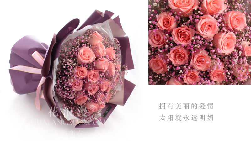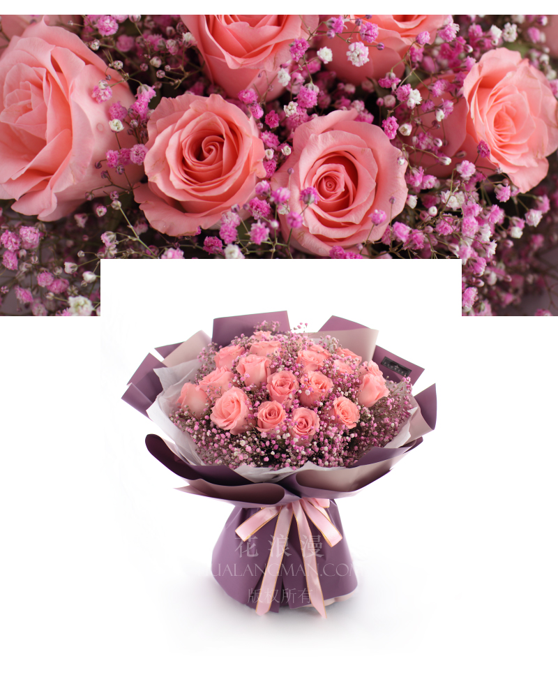 - 19枝戴安娜玫瑰,粉色满天星饱满点缀;如图包装