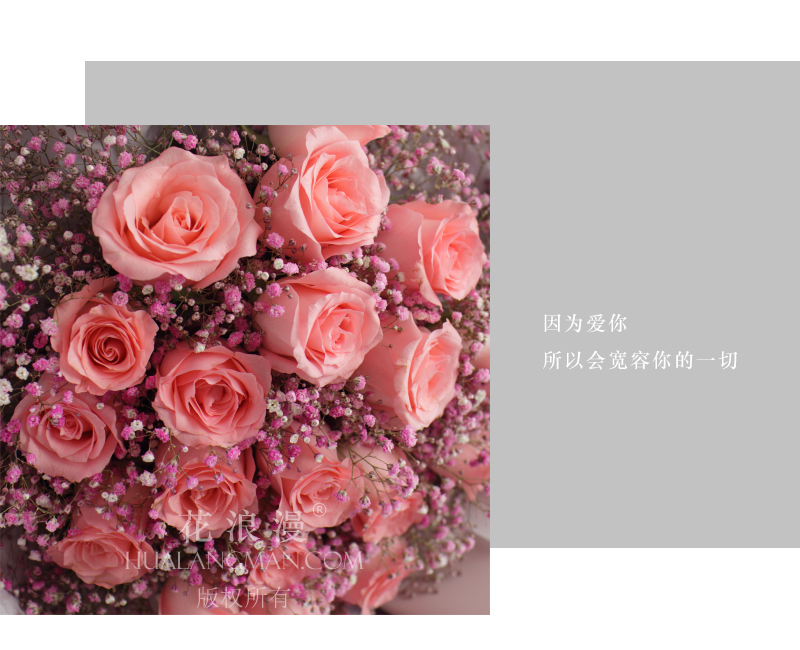 - 本款花语:粉色玫瑰通常与女性气质有关,因此,粉玫瑰的含义自然是优雅和甜美。另外粉玫瑰还代表着温柔、欣赏、喜悦、感恩、初恋。