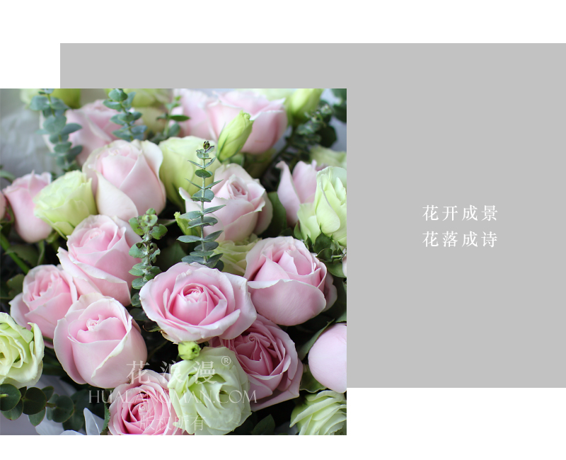 - 19枝粉雪山玫瑰(或用戴安娜或其它粉玫瑰替代),6枝多头桔梗,尤加利;白色雪梨纸内衬,浅灰色欧雅纸包装,丝带。