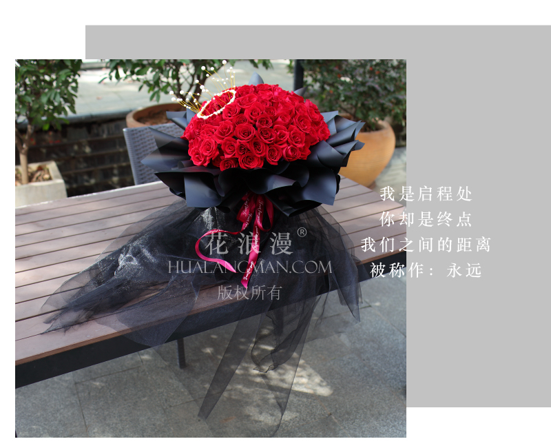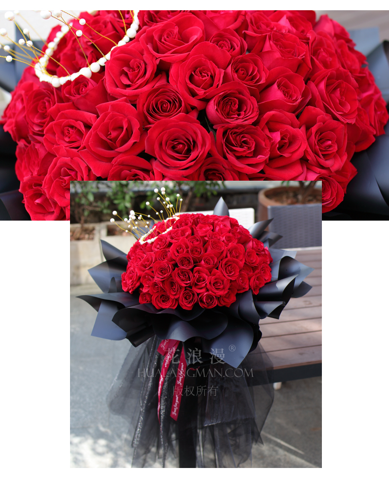- 99枝红玫瑰,皇冠装饰物;如图黑色包装,黑色长纱